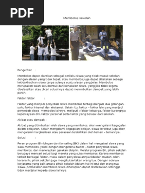 Adapun penulisan makalah ini berjudul membolos sekolah. Sifat dasar anak tidak disiplin, sering berbohong, memiliki hoby tertentu, motivasi belajar rendah serta kondisi pribadi siswa yang merasa rendah diri karena merasa Nikah, ada yang ikut geng motor, ada yang bolos sekolah. Sementara itu, psikolog dian apriyatni psi mengatakan, kebiasaan bolos sekolah itu disebabkan oleh banyak faktor. Pada saat berangkat sekolah siswa tersebut masih izin kepada orang tua mereka untuk berangkat sekolah, tetapi kenyataannya mereka tidak sampai disekolah.disebabkan terlambat dan ahirnya siswa tersebut membolos.